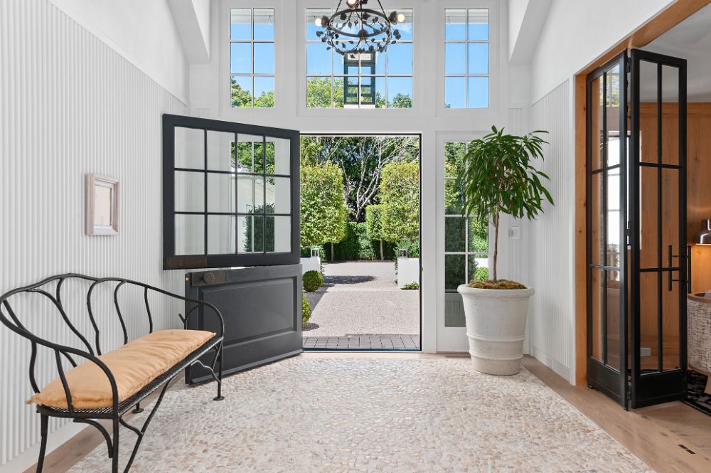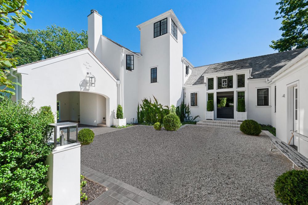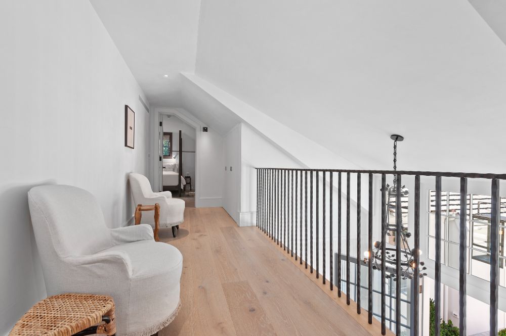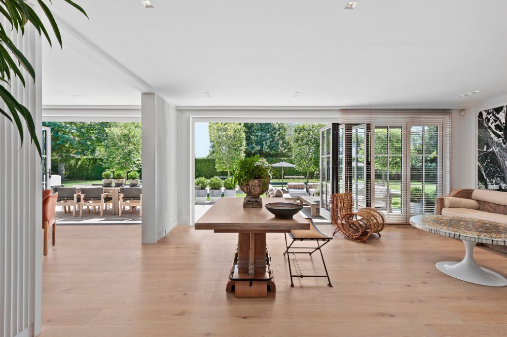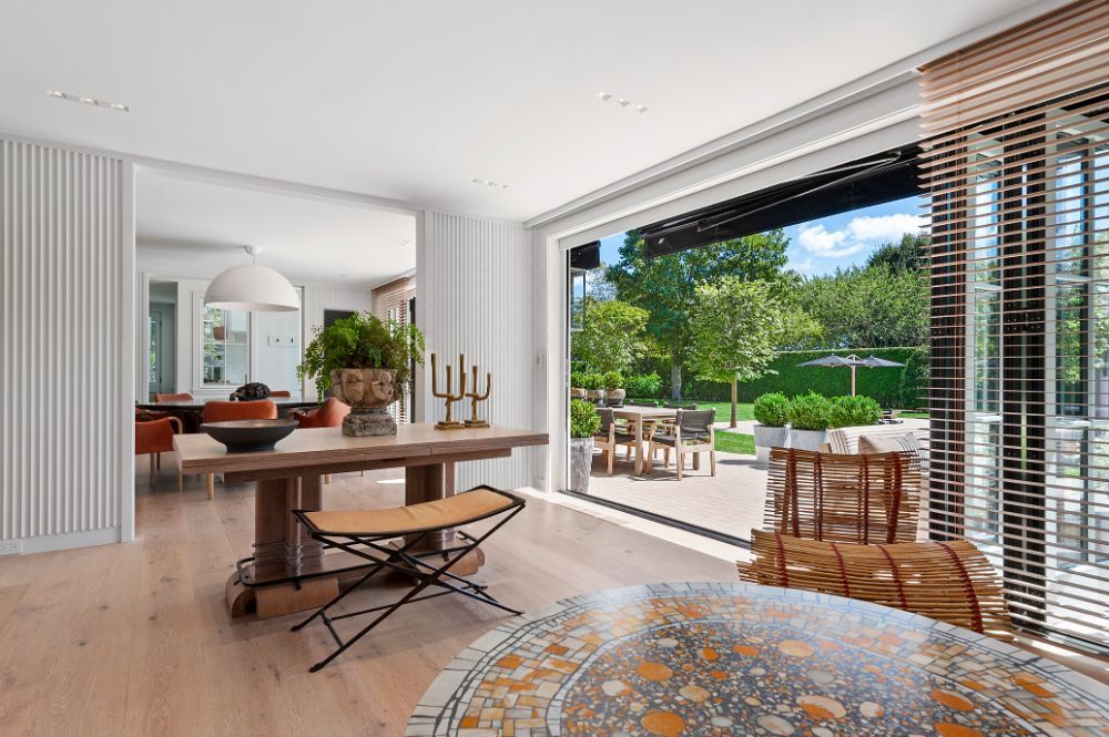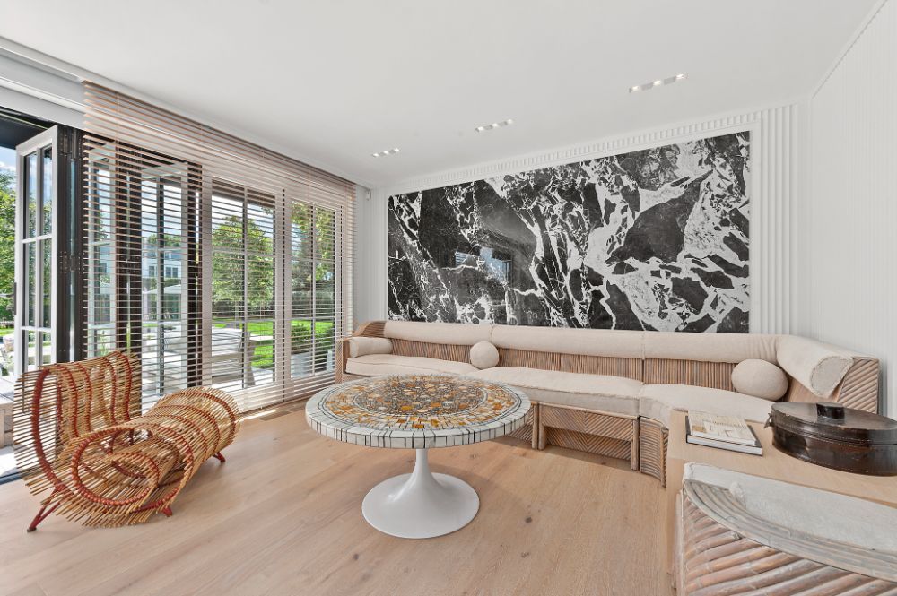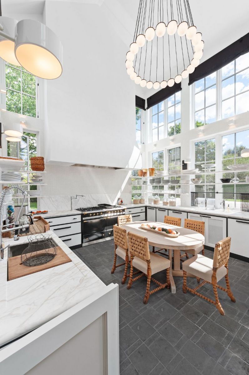 A sensible floor plan includes a sitting room, a sunroom, a first floor guest wing featuring two bedrooms and two bathrooms, a mud-room and a laundry room. The formal dining (though, this home feels more relaxed and inviting than formal) and large living room with fireplace each have access to separate terraces and views of the garden. The heart of the house is home to the spectacular double-height kitchen which needs to be seen to be appreciated with slabs of stunning marble, walls of glass and an impressive ceiling height of 22 feet.