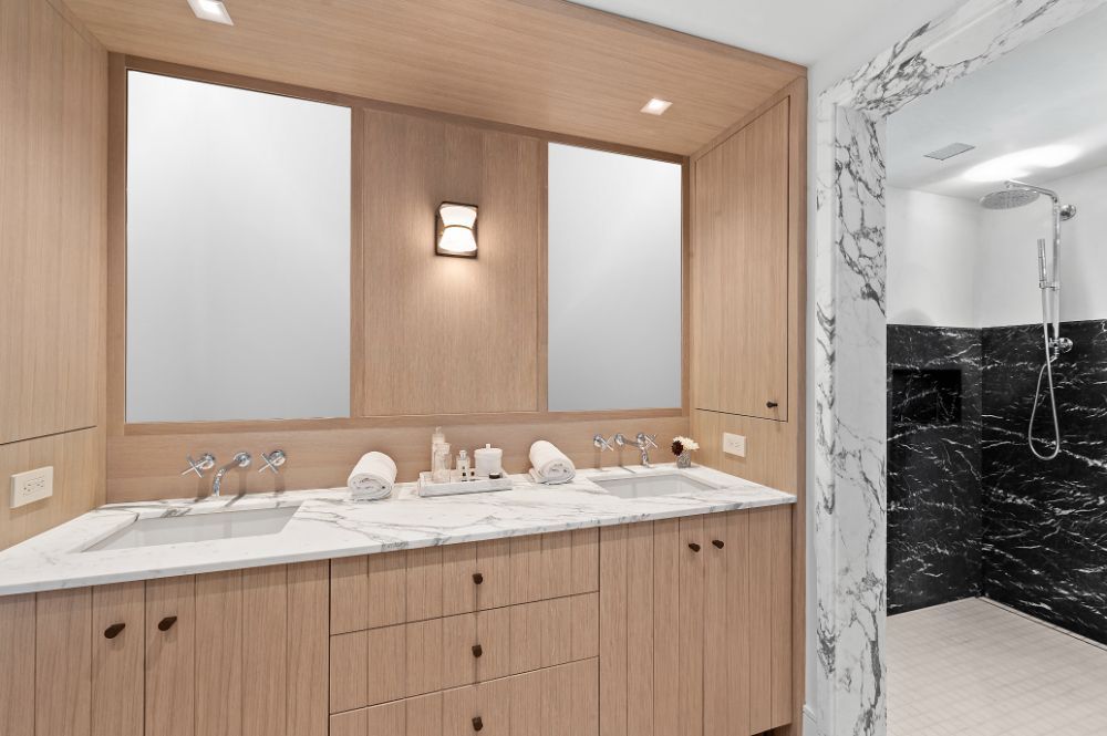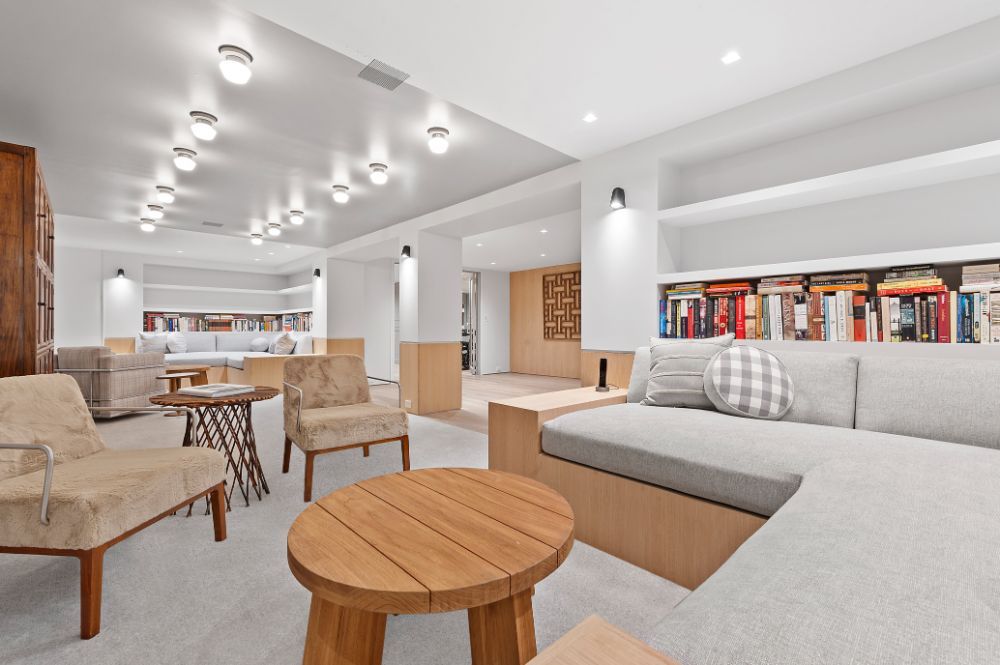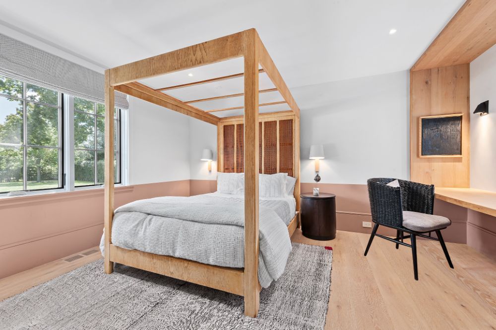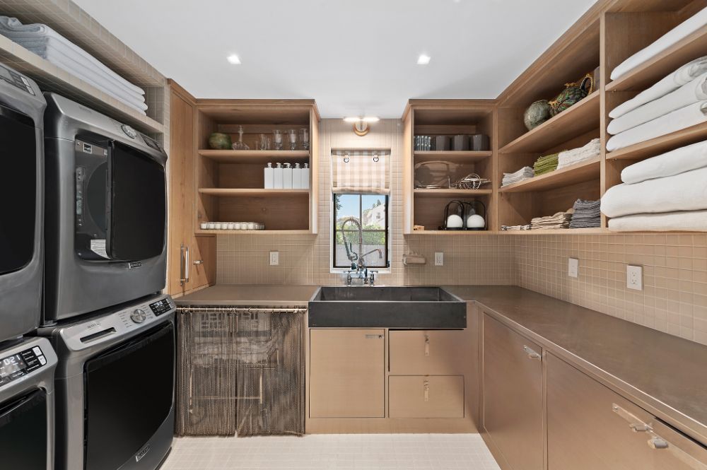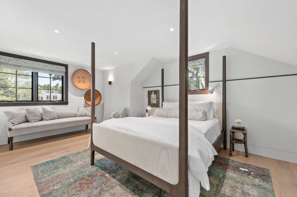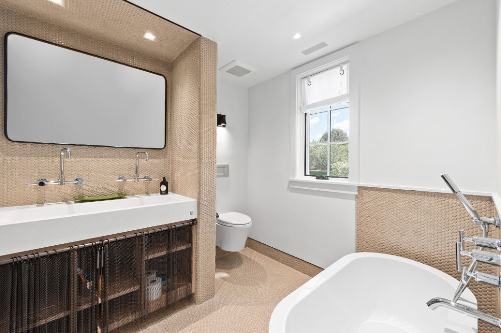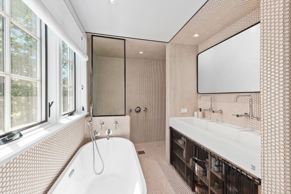 A sensible floor plan includes a sitting room, a sunroom, a first floor guest wing featuring two bedrooms and two bathrooms, a mud-room and a laundry room. The formal dining (though, this home feels more relaxed and inviting than formal) and large living room with fireplace each have access to separate terraces and views of the garden. The heart of the house is home to the spectacular double-height kitchen which needs to be seen to be appreciated with slabs of stunning marble, walls of glass and an impressive ceiling height of 22 feet.