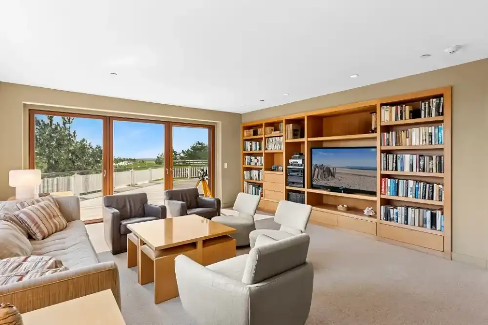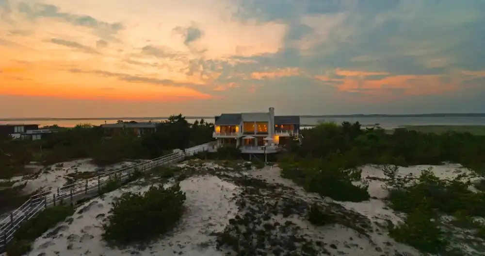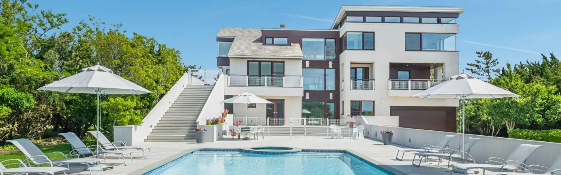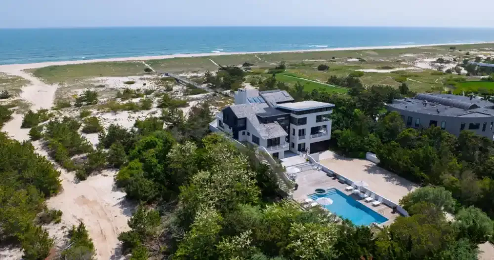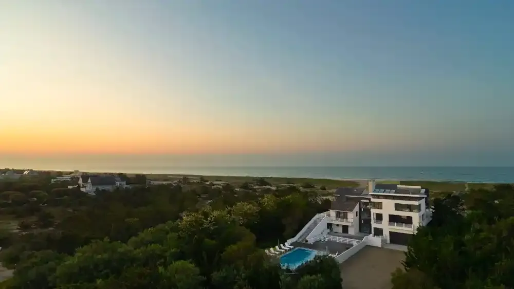 Room for everyone this summer on Meadow Lane. A captivating modern residence in beautiful condition with wide frontage and surf break views of the Atlantic Ocean as well as jaw-dropping sunset views of Shinnecock Bay. Breathtaking ocean and bay views, combined with an abundance of natural light, fill each room through expansive glass walls and skylights, offering an exceptional seasonal living experience across 8,293 square feet of modern coastal design. Upon entering the first floor, you’ll be welcomed by a stunning foyer featuring an elegant staircase that leads to a spacious open living area, complete with a beautiful fireplace and an open dining space, alongside a wet bar that provides access to a deck overlooking the tranquil ocean waves. The eat-in kitchen serves as a delightful haven for even the most discerning chef, with an expansive breakfast area that allows the salty breeze to mingle with your morning coffee. Two en-suite bedrooms on this level continue to showcase views of the surrounding water and natural beauty including the adjacent Peconic Land Trust preserve. Ascending to the upper floor, you’ll discover a luxurious primary retreat, complete with its own staircase and breathtaking ocean views from a private terrace. Separate from the primary suite are four additional en-suite bedrooms, ensuring every guest can enjoy the stunning Shinnecock Bay vistas and experience a five-star resort atmosphere. The first level further embraces the coastal allure with four more en-suite bedrooms and a large walk-out recreation room. Stepping outside, the amenities extend to a wraparound deck, a bay-side pool, and a long private boardwalk leading to the Atlantic Ocean, complemented by a substantial conservation easement that adds an extra layer of privacy.