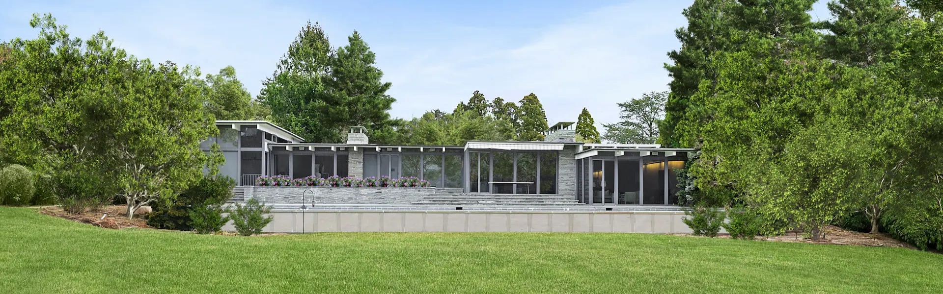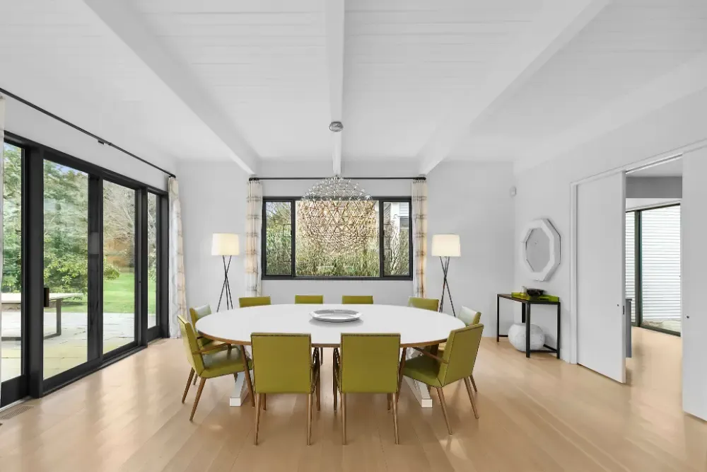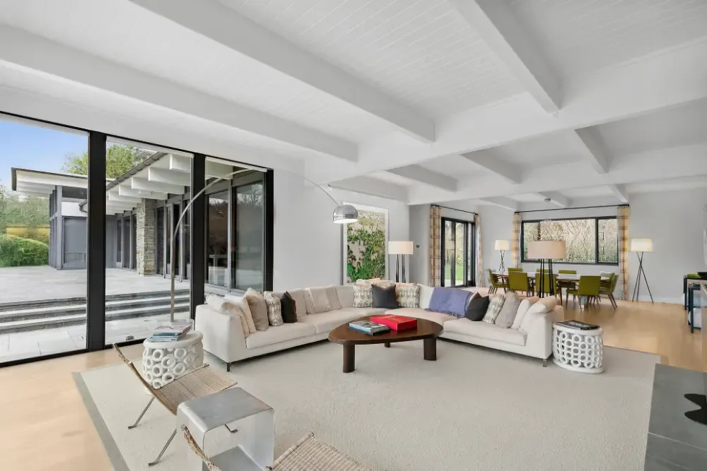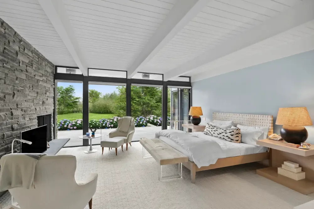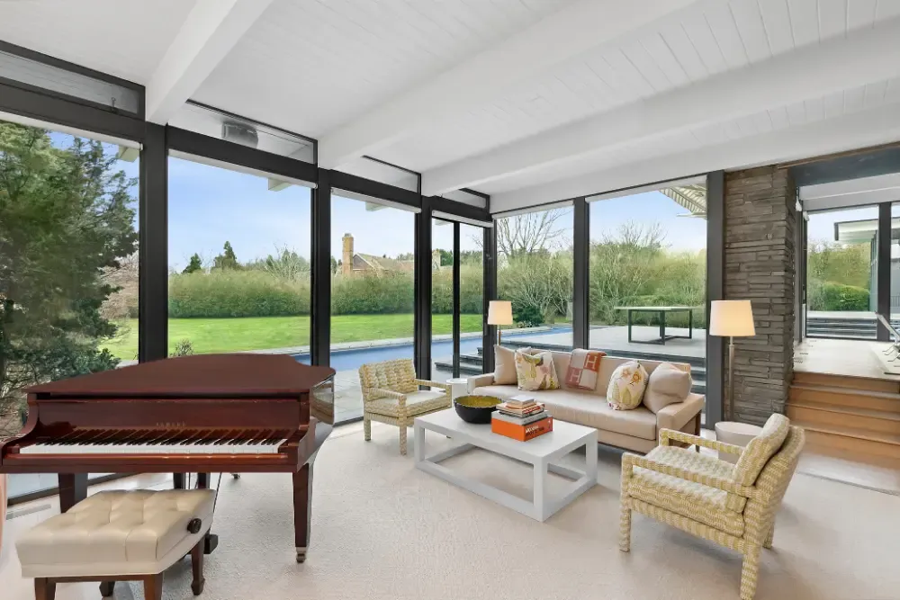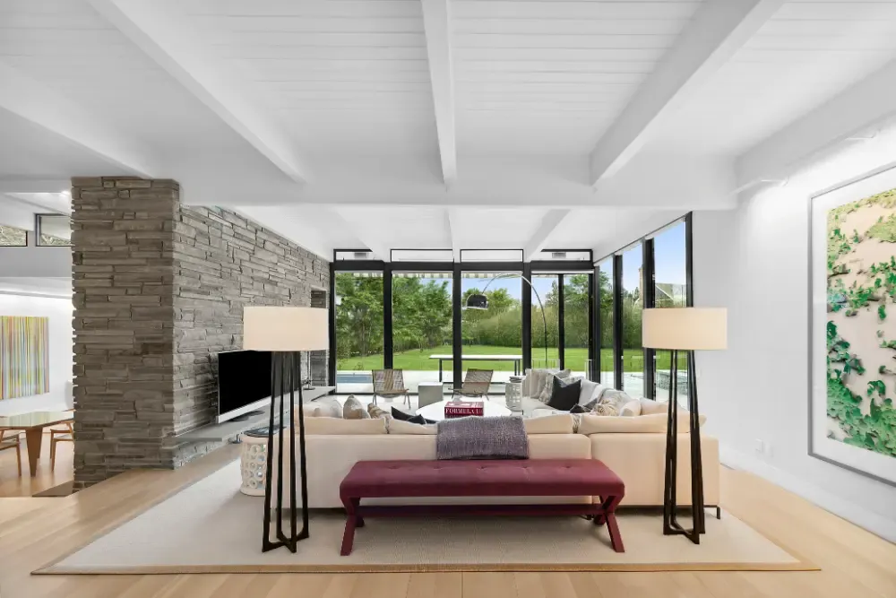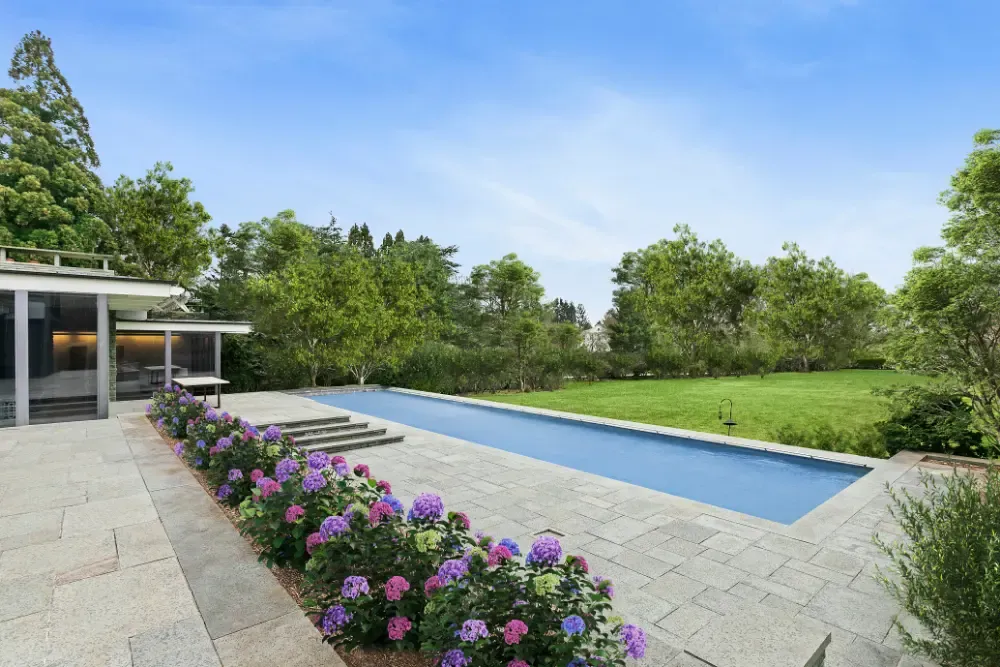 Step into a private and gated 2.7+ acre estate that sets the scene for the perfect summer getaway. This sprawling, one-story mid-century modern residence boasts 6,000 square feet, an 80-foot south-facing pool, and an expansive stone patio. Oversized windows fill every room with natural light, showcasing the beautifully landscaped grounds that complement the exquisite decor. Two generous living areas are linked by a double-sided fireplace, while two spacious guest suites feature their own stone fireplaces. The primary bedroom includes two bathrooms, an office, and a private gym. Additionally, there are two more guest bedrooms, each offering privacy and views of the garden. Among the custom features is a bright and thoughtfully designed professional kitchen. The basement includes a bonus room and a second laundry area. The outdoor lawn and garden provide the perfect setting for afternoon barbecues, croquet parties, and all the summer activities you can enjoy in the Hamptons.