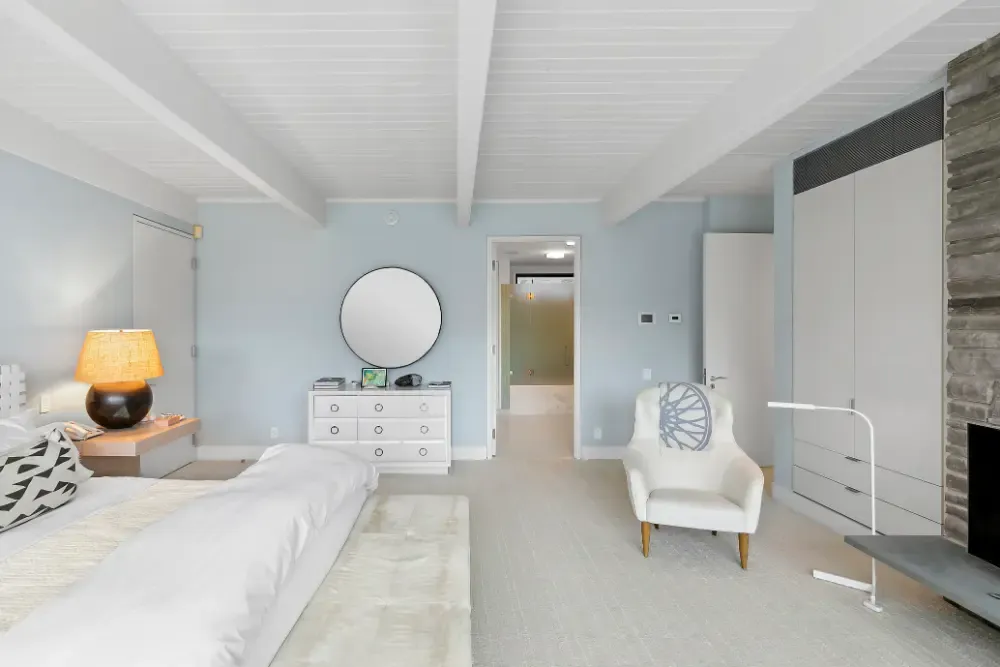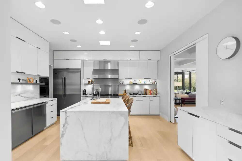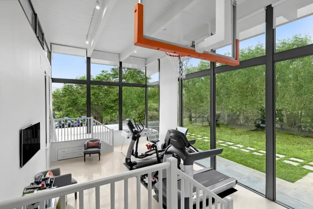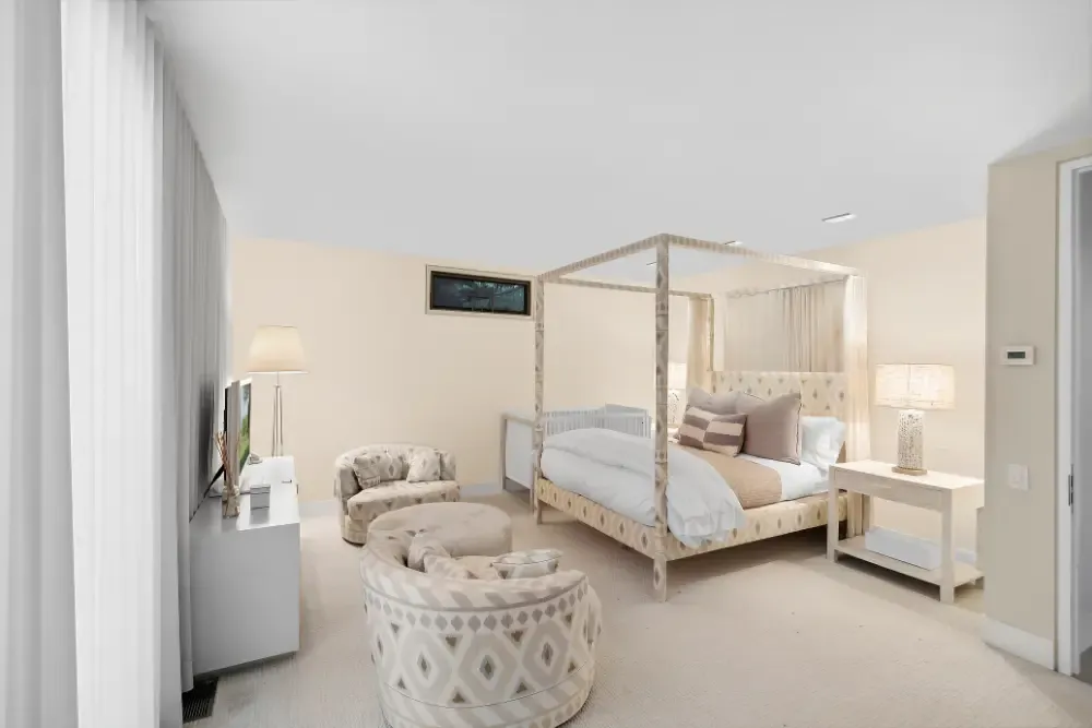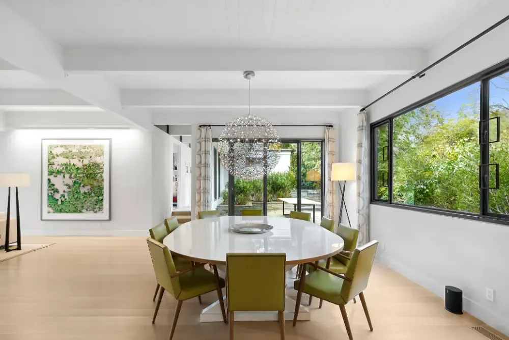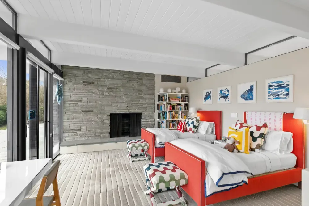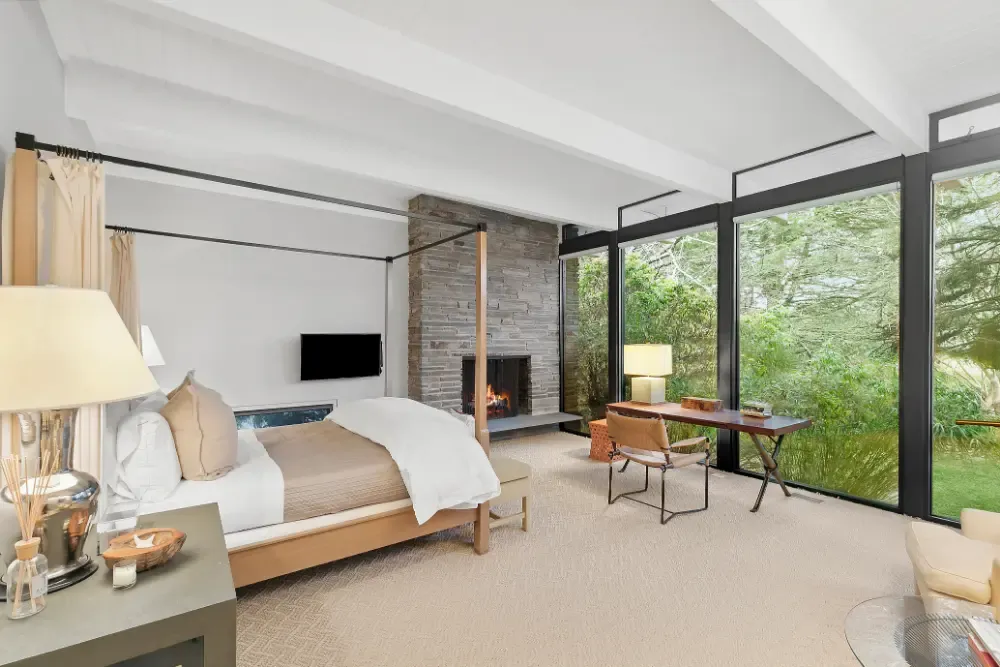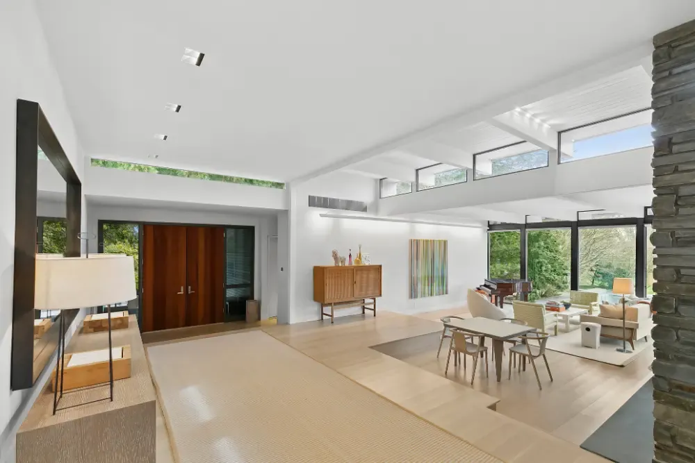 Step into a private and gated 2.7+ acre estate that sets the scene for the perfect summer getaway. This sprawling, one-story mid-century modern residence boasts 6,000 square feet, an 80-foot south-facing pool, and an expansive stone patio. Oversized windows fill every room with natural light, showcasing the beautifully landscaped grounds that complement the exquisite decor. Two generous living areas are linked by a double-sided fireplace, while two spacious guest suites feature their own stone fireplaces. The primary bedroom includes two bathrooms, an office, and a private gym. Additionally, there are two more guest bedrooms, each offering privacy and views of the garden. Among the custom features is a bright and thoughtfully designed professional kitchen. The basement includes a bonus room and a second laundry area. The outdoor lawn and garden provide the perfect setting for afternoon barbecues, croquet parties, and all the summer activities you can enjoy in the Hamptons.