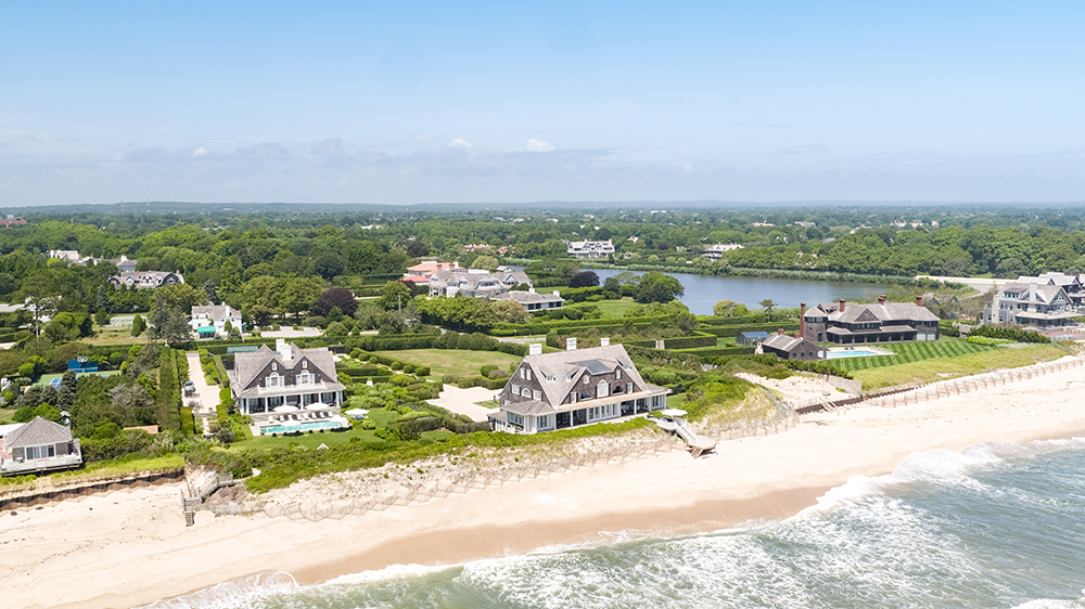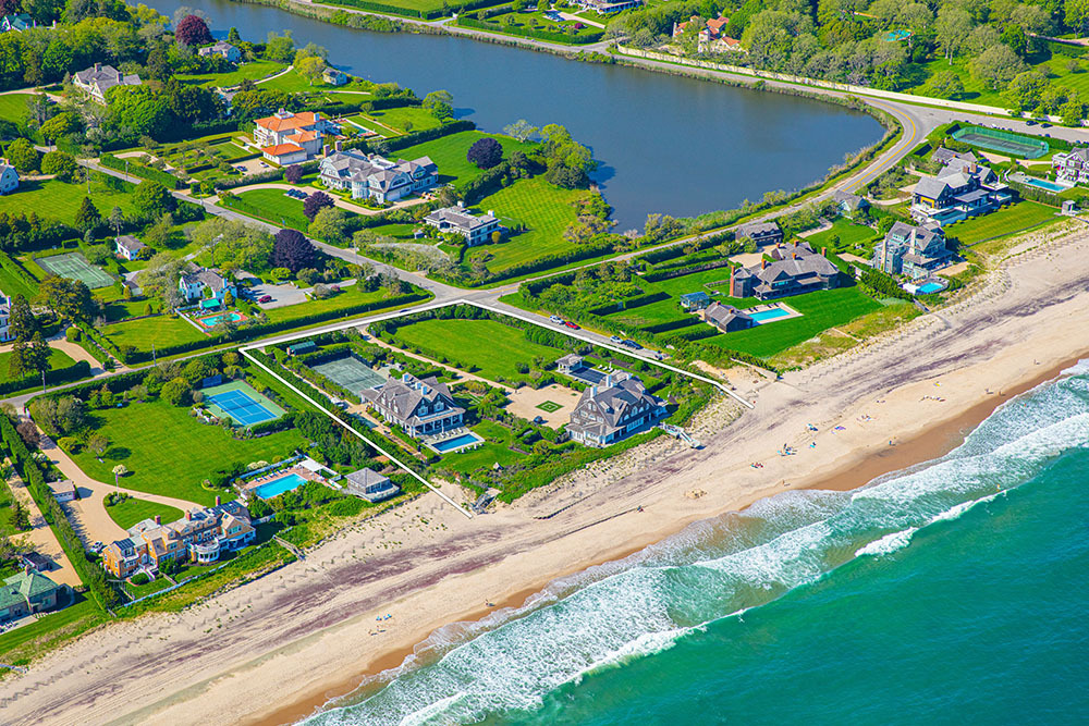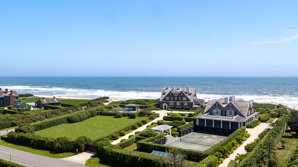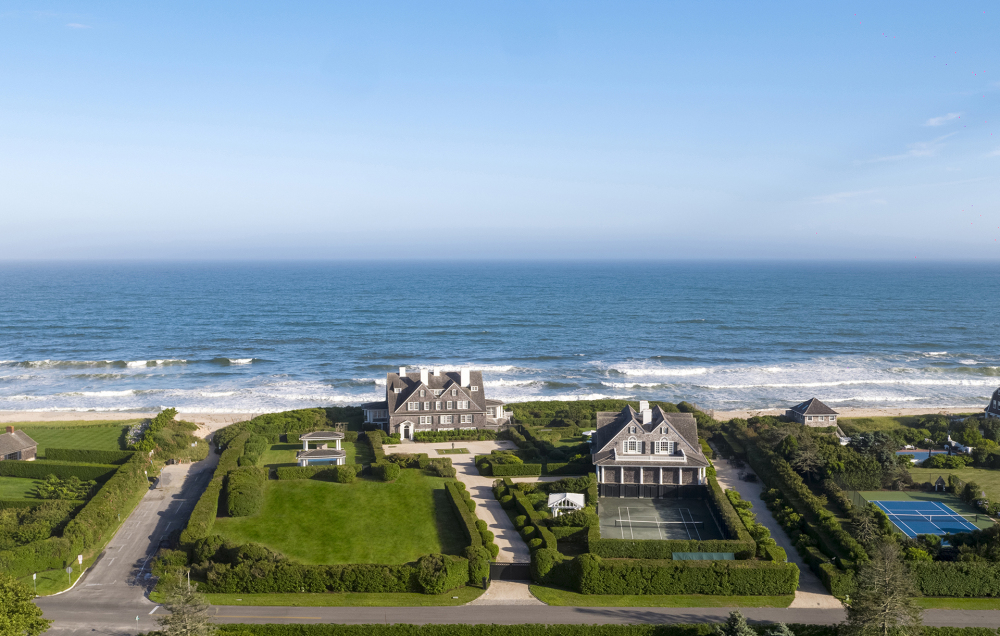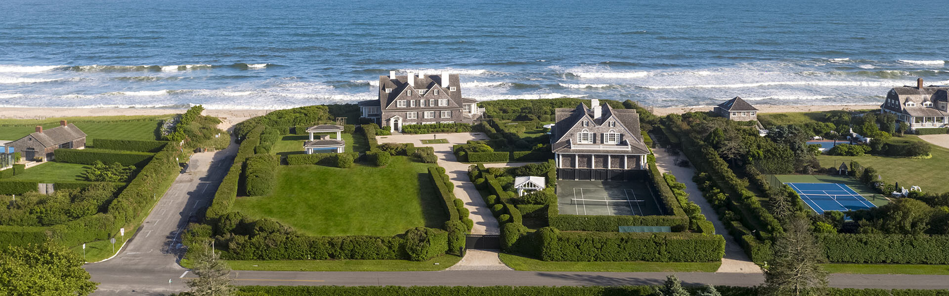 Regarded by many as one of the finest oceanfront estates in all of the Hamptons, the iconic “La Dune,” with links to architect Stanford White offers two extraordinary residences on almost four acres, with over 400 ft. of bulkhead beach front, gorgeous hedged lawns, two custom Gunite pools, and sunken all-weather tennis court exquisitely positioned along word renowned Gin Lane. Security gates and hedging open to a wide gravel drive, with the main four-story residence rising majestically from its front parking court. Constructed in the early 1900s, the classic shingle-sided presides over rosa rugosa dunes that slope down to the wide sandy beach. The gathering rooms across the second level open across a series of decks and patios that all take in ocean breezes, and from which one can watch the ceaseless waves. The second, wholly separate guest residence, was built nearly 20 years ago using the finest of quality architectural details and construction in order to reflect the design and proportions of the main house. A ground floor, brick-floor entry hall with full bath opens the main residence, and a grand staircase rises to the main level with great, living, sun, formal dining, and morning rooms, family kitchen with fireplace, and a sitting room with powder room. An elevator services all levels. The third level features the master wing with sitting room, two over-sized baths, and large dressing room/closet. The top level includes four bedrooms and three baths. Located back at ground level, are a full service kitchen, office, gym area, laundry facility, and staff suite. The guest residence opens with a long entry hall, off of which are a parlor, great room, and dining room that all open onto a covered deck. Opposite is a library with bath, kitchen, and a guest/staff wing with powder room and two bedroom suites. The second story features four generous guest suites, and the finished lower level includes a billiards and bar room, a gym with steam, sauna and massage room, theater, additional staff suites and laundry. The extensive grounds include two covered pavilions at either end, two swimming pools, and a tennis court. The ocean views and setting are sublime embracing the best of seaside living experienced only in the finest locales around the world.